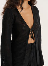 The summer essential you've been looking for, the black Antoine tie front top comes in a breathable, open knit fabric - perfect for layering over your bikini. Featuring long sleeves with slightly flared hems, it can be tied at the front or left open for versatile styling. Wear with the matching Antoine shorts for a beach set of dreams.