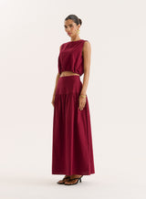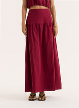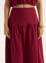 In a gorgeous burgundy hue, the Selene maxi skirt embraces summer dressing with a drop waist, A-line silhouette and gathered skirt finish. Made from a soft cotton fabric to keep you comfortable in the heat, we're wearing it with the matching Selene top for a refined co-ord look.