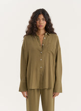 The Anna shirt is a spring staple. Designed for an elevated everyday, this oversized style see's an Olive linen fabric with a button front fastening and traditional shirt features. The ultimate hybrid of comfort and style, pair with the Anna trousers and sandals for an off-duty look.