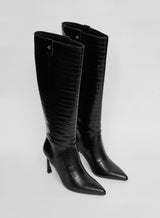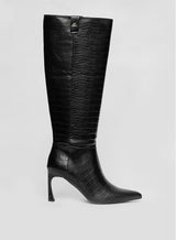In a croc faux leather finish, the Manchester boots are a statement addition to your winter collection. Bringing you from day to night, these knee high boots are designed with a curved heel, pointed toe finish and 4th metal logo. Pair with your fave satin maxi skirt.