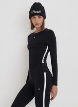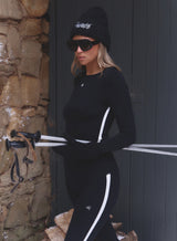 From our après ski collection, the Indra long sleeve active top takes you from afternoons on the slopes to chalet lounging and beyond. In a neutral black hue with white contrast piping detail, it's made from a soft pique fabric with sweat-wicking qualities. Wear with the matching Indra leggings.
