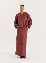 Dress with purpose this season in the Lorna faux suede skirt in a burgundy hue. Designed in a classic maxi length, this elevated essential features a belt-loop waistband that sits flatteringly at mid-rise height, along with front pockets, a tailored back slit and seam detailing for visual impact. For statement look, pair with the Lorna bomber jacket and simple accessories.