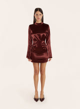 Contemporary design meets timeless elegance in the Odette dress. Crafted from a luxurious satin fabric in a burgundy hue, this design drapes to the natural curves of the body in a flattering silhouette. With a high neck and long-sleeves, it's an elegant option to pair with heels and a simple clutch.