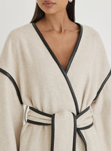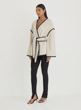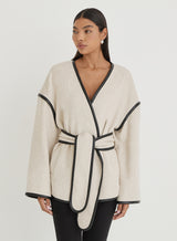 You'll be reaching for the Hariette oversized wool jacket all season. Instantly elevating all your autumn outfits, it features a wrap around, tie up design with PU contrast trims for an elevated feel. Seen in a dreamy cream hue, it boasts a contemporary collarless neckline and practical side pockets.