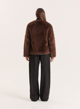 A refined piece in your winter coat collection, the Jackie faux fur jacket is a seasonal must-have. A modern silhouette meets a classic design, with a collarless neckline and contrast toggle fastening. The deep chocolate brown hue is perfect for autumn winter styling. Layer over basic outfits for an elevated day-to-night look that requires minimal effort.