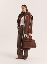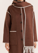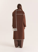 Introducing the Fable maxi coat - an instantly elevated winter look with no styling notes needed. Crafted from a soft finish wool-blend fabric, the longline coat comes in a warm chocolate hue with contrast scalloped edges. Coming with a detachable matching tassel scarf for versatile styling, it features a single button up design with slip pockets.