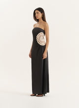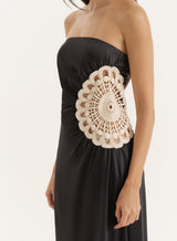 The ultimate holiday evening dress, the Cherry maxi dress features an elegant yet simple silhouette with a strapless bandeau neckline. Crafted from a soft satin in a staple black hue, it's elevated with a crochet cut out insert at the side with ruched detailing. We're envisioning summer events and golden hour drinks.