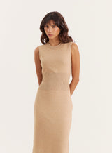 The Dia Dress is where sophistication meets sleek, modern design. Crafted from soft, camel-toned knit, this sleeveless maxi dress is made to flatter and contour your shape. With its high neck, ribbed corset detailing, and figure-hugging silhouette, the Dia Dress is the ultimate in understated luxury and chic versatility. Finish the look with heels.