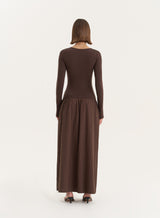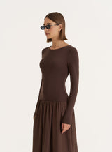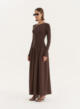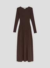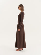 The Rosie contrast dress gives effortless vibes. The simple design boasts a long sleeved shape with a fitted bodice that hugs the skin. The dropped waistline skirt creates an uber cool silhouette that is complimented by a voluminous skirt. Sitting at midaxi length, this piece can be dressed up or down to suit all occasions.