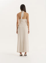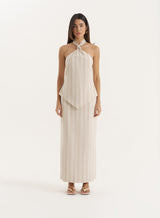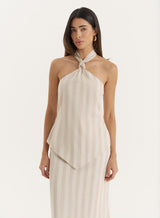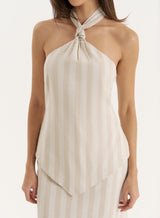 In a gorgeous halter neck design with knotted detailing, the Tate top creates a super flattering shape with an exposed back detail. With an elongating pointed hem design, it features a tonal stripe print in a timeless beige hue. Wear with the matching Tate skirt for an instantly elevated summer co-ord outfit.
