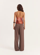 For long summer days that turn into unforgettable evenings, the Saskia halter top has end-of-summer dressing covered. In a rust tie dye print, it features a flattering high neck halter style neckline and exposed back. In a double layer mesh fabric for a stretchy fit, it sits at hip length for an elongating fit. Style with a cream satin skirt.