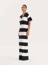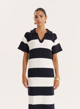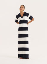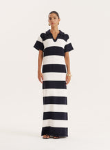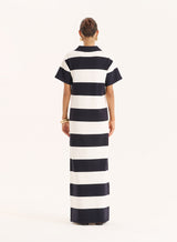 Our signature rugby-inspired design transitions effortlessly into the Esme dress. Made from a soft knitted fabric, the polo maxi dress features short sleeves, collared detail and a classic v-neckline for an understated preppy feel. Coming in a bold black and white stripe, it requires minimal styling efforts to achieve a put together look - pair with chunky sandals and oval sunglasses.