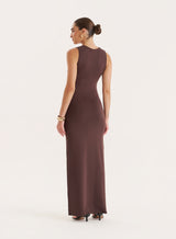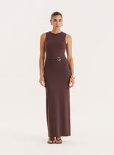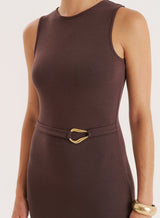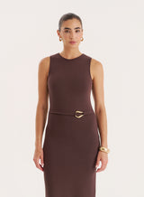 Designed to be a timeless addition to your everyday wardrobe, the chocolate Arden dress blends simple design with modern detailing. Crafted in a soft jersey fabric for a comfortable fit, it features a sleeveless design with a round neckline, fitted bodice and a hardware belt detail at the waist to create a cinched silhouette. Wear with heeled boots for day-to-evening dressing.