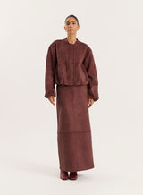 Street style influences meet polished design in the Lorna faux suede bomber. A piece that blends practicality with timeless design, it features an elasticated hem, cuffed sleeves, popper fastenings and a classic bomber-style collar. Crafted from an ultra-soft faux suede fabric, it pairs seamlessly with the Lorna maxi skirt for an elevated, off-duty look.