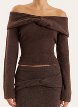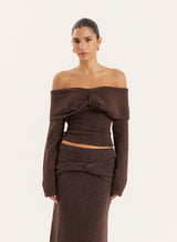 Crafted from an ultra-soft knitted fabric, the Selene top blends comfort with sleek sophistication. In a timeless chocolate brown colourway, this off shoulder top is elevated with a fold over neckline, long sleeves and a knotted detail. Designed to allow an effortless transition from day to night, pair with the matching Selene skirt for a look that's stylish and intentional.