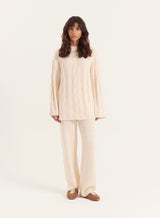 A nod to the cooler weather but still bringing a summer feel, the Leonor ecru knitted jumper falls to a relaxed, oversized fit with a modern cable knit design. Featuring dropped shoulders, slightly flared sleeves and a ribbed crew neckline, it's the ultimate cross-seasonal knitwear you can throw on with floaty trousers and chunky sandals.
