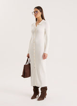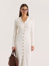 In a neutral cream hue, the Taye knitted dress blends comfort with refined detail to create a versatile everyday dress. In a maxi length, it features long sleeves and a polo collar design, elevated with gold 3D buttons at the centre and on the sleeve cuffs. Dress it up with slingback heels for your evening plans.