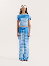 Bringing coastal vibes to your next summer trip, the Livia trousers are made from a soft towelling fabric making them the perfect throw-on piece for beach afternoons and balcony mornings. In a dreamy blue and white stripe, they feature a comfy elasticated tie-up waistband and relaxed straight leg. Wear with the matching towelling top.