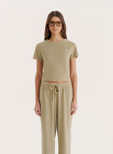 An effortless holiday piece, the Livia green t-shirt is made from a soft towelling fabric - making it the perfect addition to your suitcase this summer. Cut to a cropped length, it's designed with a crew neckline and short sleeves to a fitted shape. Layer over your bikini or wear with the matching towelling trousers.