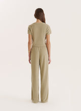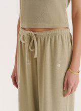 Bringing a relaxed feel to your next summer trip, the Livia trousers are made from a soft towelling fabric - the perfect throw-on piece for beach afternoons and balcony mornings. In muted green hue, they feature a comfy elasticated tie-up waistband and relaxed straight leg. Wear with the matching towelling top.