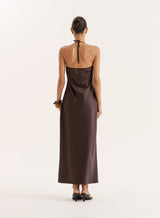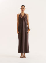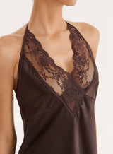 Chocolate Lace Trim Halterneck Satin Maxi Dress- Blair