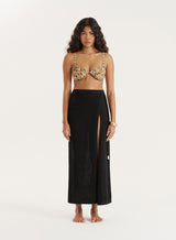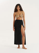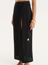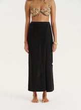 Effortlessly transitioning you from a morning poolside to sunny afternoon strolls, the black Celi beach maxi skirt is the ultimate holiday piece. In a detailed crochet knit, it comes in sarong style wrap design that creates a flattering split leg silhouette. Finished with a pearl trim, pair it with a swimsuit for a gorgeous beach day look.
