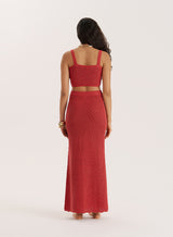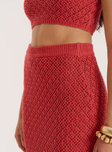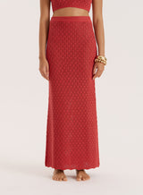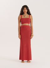 In an effortless maxi length, the Sierra skirt is a versatile, day-to-night piece for the summer. Crafted from an intricate crochet knit, it comes in a chili-inspired red hue, finished with scalloped edge hems. Designed with a high fitted waistband in a slim silhouette, we're wearing it with the matching Sierra top for vibrant holiday nights.