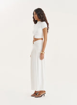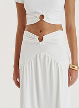 We’re envisioning sunset strolls in the gorgeous Nancie skirt. Shaped to a slightly flared silhouette, the maxi skirt has a low drop waist design and ring hardware at the centre. Wear with the matching Nancie top for the perfect holiday co-ord.