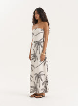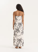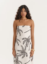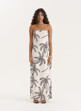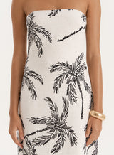 Our holiday muse has arrived. The perfect holiday evening wear, the Carmel midaxi dress is made from a lightweight, linen-blend fabric with a bandeau strapless neckline and simple slip design. Perfect for sunset drinks, the monochrome palm tree sketch print takes centre stage, just pair with simple gold bangles and strappy sandals.