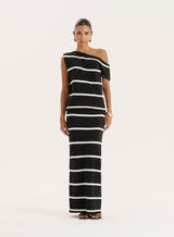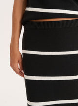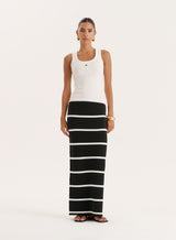 In a summer knit fabric, the Aisa midaxi skirt is a versatile piece that transitions you from end-of-summer plans to the beginning of autumn dressing. A pull on, soft and comfy design in a body-skimming fit, it boasts an elegant monochrome stripe print. Wear with the matching Aisa top or style back with basic vests and oversized jumpers.