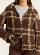 Embrace tonal styling this season with the Samira knitted jacket in warm brown hues. A bold check print, double zip feature and wide collar combine to give this piece its edge, perfect for adding a touch of elevation to your autumn jacket collection. Layer over a casual outfit to let the jacket make the statement.