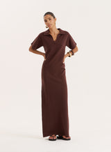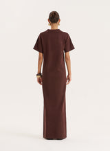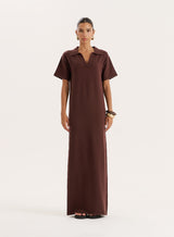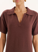 Our signature rugby-inspired design transitions effortlessly into the Esme dress. Made from a soft knitted fabric, the polo maxi dress features short sleeves, collared detail and a classic v-neckline for an understated preppy feel. Coming in deep chocolate brown hue, it requires minimal styling efforts to achieve a put together look - pair with chunky sandals and oval sunglasses.