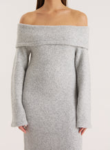 In a soft knit fabric, the grey Sable dress elevates autumn winter dressing with minimal effort required. In a maxi length, it features a flattering layered bandeau neckline with long, relaxed sleeves. Figure-hugging and comfortable, slip on with your go-to heeled boots for office to dinner drinks.