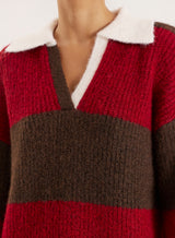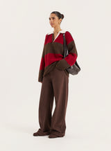 Designed to cover all your style moods, the Ruby jumper runs in an effortlessly-cool, oversized silhouette. A bold burgundy and chocolate stripe sits against a contrasting cream polo collar, making for a colourway that is elevated yet wearable. To tap into the rugby-style trend this season, pair with wide leg trousers and loafers for a chic, heritage look.