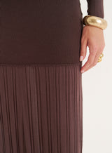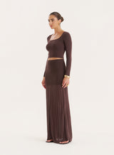 It's the skirt of the moment. The Nancy maxi skirt comes in a trending drop waist with a knitted panel design, offset with a floaty, pleated skirt in a slightly sheer fabric. Fitting true to size with a slimming silhouette, it's the perfect balance between trend-led and timeless femininity. Updated for the autumn season in a stunning chocolate hue, pair it with the matching long sleeve top for an elevated evening wear look.