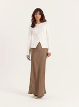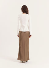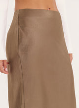 Cut to a flattering midaxi length, the Novah satin skirt is the ultimate wardrobe essential for trans-seasonal dressing. In a body skimming, straight silhouette, it's updated in refined khaki hue - pairing well with everything from basic white tees to our everyday vests. Wear with pointed slingbacks and your favourite accessories for a day to evening look.