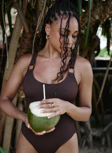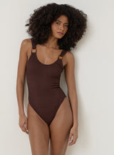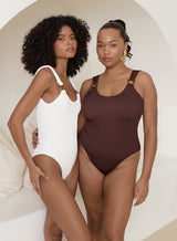 Our Cala swimsuit is a simple design, featuring a crinkle jersey fabric in a classic scoop neck silhouette. With thick straps, this timeless white piece is complimented by a contrasting tortoise shell square buckle detail. Throw on an oversized black shirt and you've got the perfect pool fit.