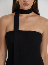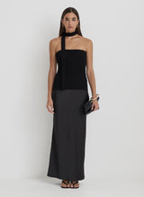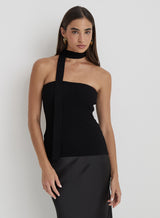 Exuding a sleek and minimalist vibe, the Alexandra top is a black bandeau design coming with a 90s-inspired skinny scarf. The ribbed knit fabric remains simple yet effortlessly chic and pairs perfectly with denim jeans and black court heels.