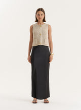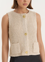 A luxe addition to your knitwear collection, the Kristy vest is designed with spring in mind. A sleeveless design with a rounded neckline, it's crafted in a fine, open-knit fabric with stitched pocket details and gold hardware buttons for an elevated finish. Wear by evening with a satin black skirt or keep it casual with your go-to denim by day.
