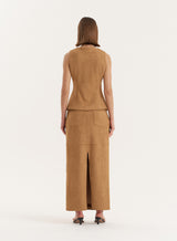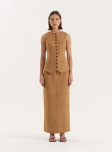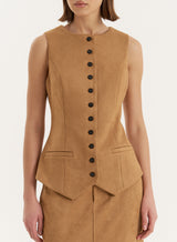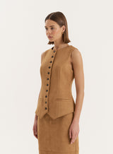 A minimal design, the Briella waistcoat boasts elegance and style. Featuring a scoop neck shape, with a subtle waist sinch and button front finish, this design is super versatile and can be dressed up or down. Style with the Stephy skirt and our Nadia heels.
