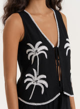 An elevated peice, our Kenna top has been designed with relaxed tailoring in mind. Featuring a casual waistocat silhouette, this style ties at the front and boasts a monochromatic hue with palmm print embroidery.