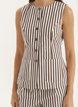 A summery retro feel, the Lisa waistcoat comes in a cotton-blend with a brown and white vertical stripe print - perfect for new season styling. Featuring a high neckline, sleeveless shape and curved hemline, the button up front is offset with slip pocket details at the front. Wear with the matching stripe trousers for a daytime co-ord look that will see you through the season.