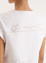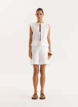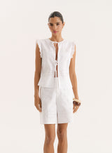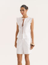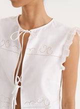 In a fresh white colourway, the Heidi top is made from a cotton broderie fabric, with intricate stitch detailing all over. A tie front design, it's finished with scalloped-edge cap sleeves and a rounded neckline. Wear with the matching Heidi shorts for the summer set of dreams.