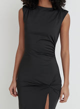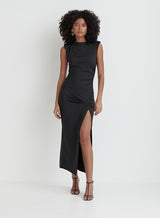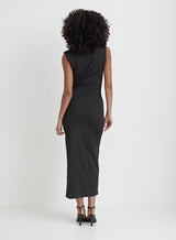 One for the glam girls. Our Verity midaxi dress, designed using a black drape jersey fabric, features a high neck and carefully positioned ruching to create a stunning silhouette. A subtle fabric knot feature sits at the upper thigh, complimented by an exaggerated side split. Style with black heels and your go-to clutch bag.