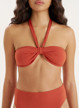 Inspired by the palette of sunset hues, the Gia bikini top comes in a deep coral hue. Featuring a tie-up halter neck design, it has ruched detailing across the bust for a flattering finish. Wear with the matching Gia bikini bottoms for your next vacation.