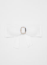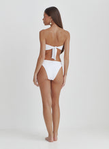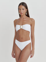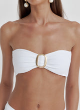 The Bambou bikini top is simply stunning. Giving old money vibes, this design boasts a bandeau shape with a bust gathered detail and gold buckle accent. Fastening at the back, this style will have you holiday ready. Style with the Bambou bikini bottom.