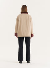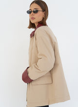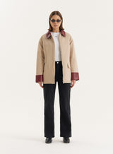The Jackson Jacket combines rugged utility with sleek, contemporary style. In a versatile beige hue, this oversized jacket features contrasting burgundy PU collar and cuffs, adding a pop of rich colour that elevates its utilitarian design. Whether you're layering it over a casual outfit or using it as a standout piece, the Jackson Jacket is all about combining function with fashion.