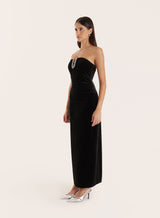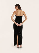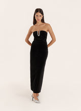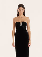 Crafted in a plush velvet fabric, the Vera midaxi dress brings a sophisticated take to partywear. In a fitted silhouette with a sleek strapless neckline, it features an embellished cut out detail at the bust. Keep styling minimal to let the dress have its moment.