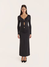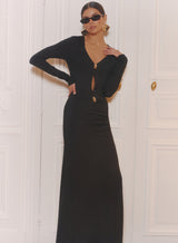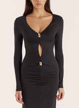 In a refined black colourway, the Angelina dress is fitting for any glamourous occasion. A simple yet impactful cutout feature is enhanced with gold hardware detailing, complete with long sleeves and a rounded neckline. Elevated and bold, all you need is a pair of heels to pair with this timeless style.