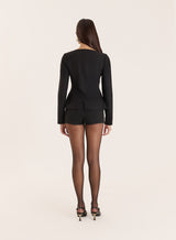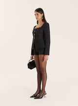 For eveningwear that's refined and timeless, welcome the Sadie jacket into your collection. In a structured tailored fabric, it features a cinched waist silhouette with chunky gold hardware buttons at the centre. A flattering shape with long sleeves and a square neckline, style with everything from jeans to tailored trousers.
